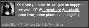 Then I went back inside the resto super happy and cold. OMG i had a close encounter with my idol. Napaka fan-girl lang! Then when I went home, I immediately tweeted her and immediately got a reply: