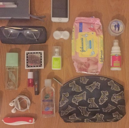my trusty Iphone6s, contact lens case (empty cause I’m using it at the moment), breath spray, sanitiser, Radley pouch bag (originally £30 but bought it on sale for £9 only), lens solution, baby wipes and rosary.